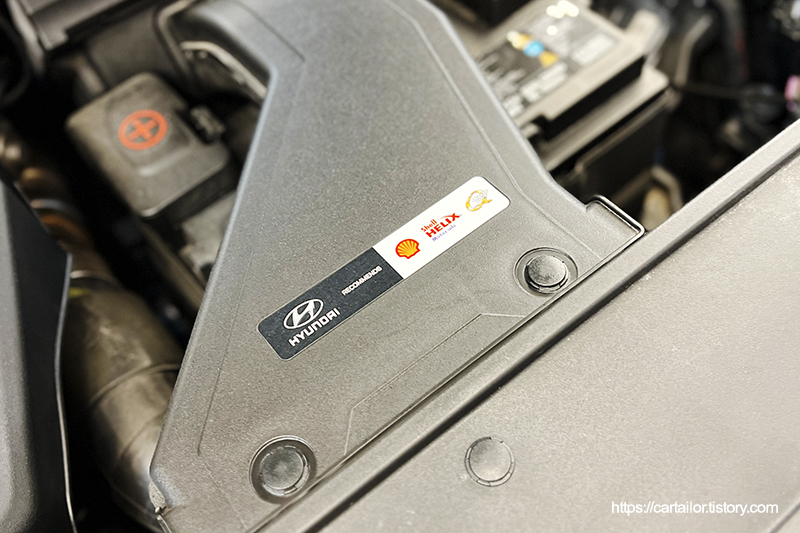 팰리세이드의 후드를 열면 에어필터 덕트 입구에 이렇게 스티커가 붙어있는데 자세히 보면 현대자동차 제조사에서 쉘오일을 추천합니다.