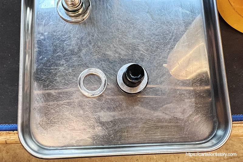 일회용 드레인 플러그 개스킷을 교체한 후 토크 렌치를 사용하여 규정 토크로 조입니다.