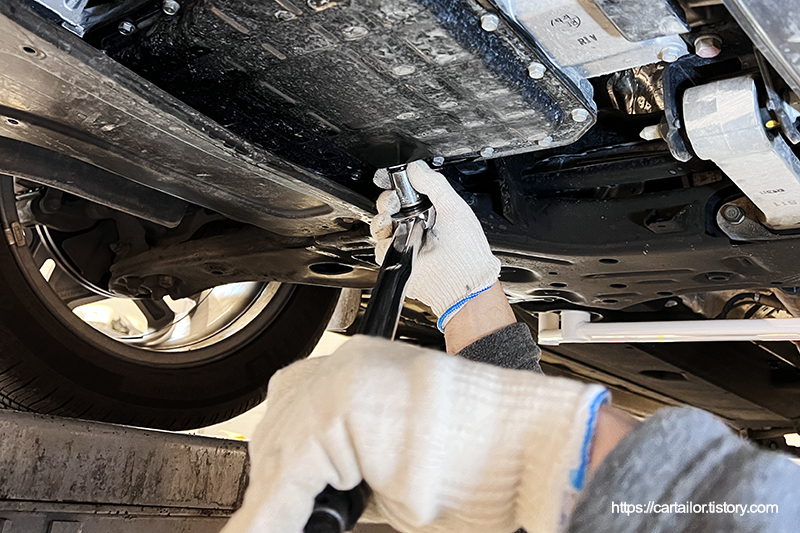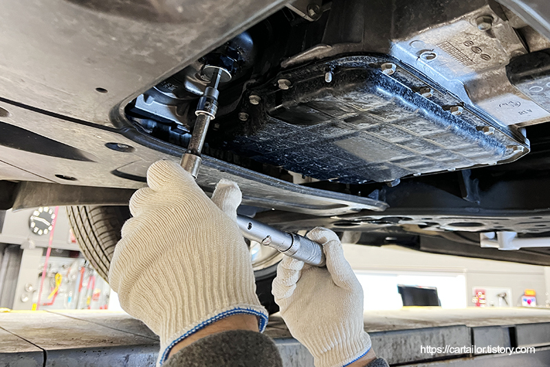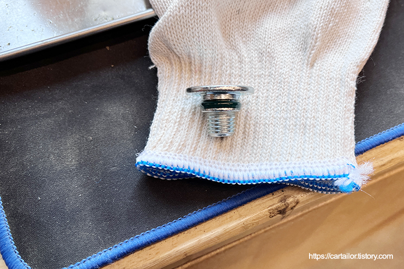 일회용 드레인 플러그 개스킷을 교체한 후 토크 렌치를 사용하여 규정 토크로 조입니다.