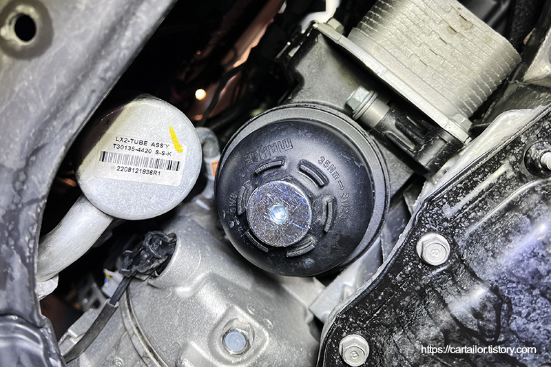 잭에 고무를 끼워 차량을 기울인 후 입으로 세게 불어 오일팬에 남아있는 잔여 오일을 배출합니다.