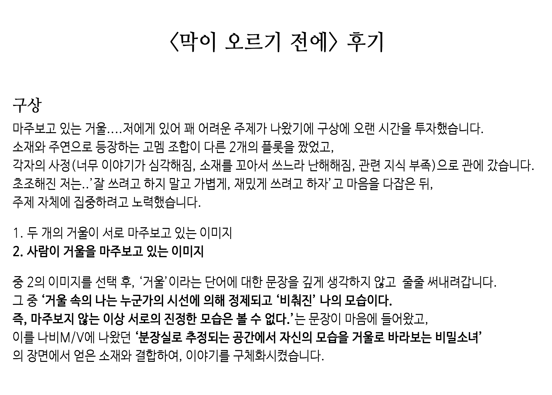 하루의 마지막 연습을 마친 그는 지쳐 쓰러진 의문의 여인과 대화를 나눴다. 그 소녀는 이것이 그녀가 그에게서 들었던 첫 번째 개인적인 질문임을 기억했습니다. 그는 목소리의 근원을 보기 위해 고개를 돌렸지만 그녀는 아니었다. 비밀소녀 옆에 쭈그리고 앉아 있던 해류시는 갈증을 해소하기 위해 이온 드링크를 마시며 앞만 바라보았다. 연습실 한쪽 벽면을 가득 채운 대형 전신거울에서 두 사람의 시선이 마주쳤다. 비밀소녀는 잠시 머뭇거리다가 말을 이었다.