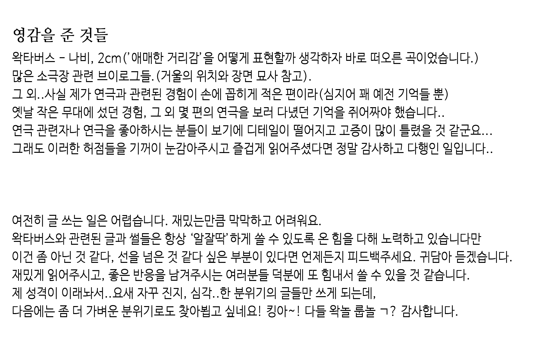 다음 장면에서 두 사람은 동시에 등장했다. 남은 대기 시간 동안 두 사람은 간단한 대화를 나눴다. 라커룸 속삭임이 새어나오면 안 된다. 극장에 오시는 관객분들은 소음에 예민하실 수 있으니 볼륨을 최대한 낮추어야 했습니다. 두 사람은 비밀을 이야기하듯 속삭였다.