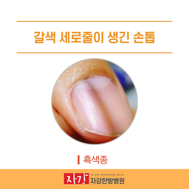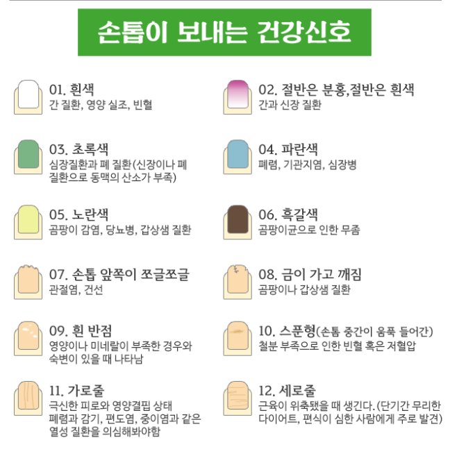 흑색종례 일러스트- 흑색종 세로줄이 생기는 경우 손톱 흑생종은 세로줄이 나타날 수도 있습니다. 피부 색소세포가 악성으로 변해서 생기는 암입니다. 흑색종은 조기에 발견하여 치료하면 예후가 좋은 편입니다. 수술, 약물, 방사선으로 치료합니다. 흑색종이 아닌 경우가 대부분이므로 너무 걱정하지 마십시오. – 세로줄 : 고령으로 인한 손톱 성장 저하 또는 스트레스로 인한 혈액순환에 문제가 생긴 경우 – 가로줄 : 고열, 감염 등으로 손톱 성장이 일시적으로 멈춘 경우조갑박리증의 예- 조갑박리증: 바닥에서 분리되어 들뜨거나 두꺼워지거나 얇아지거나 강한 세제나 매니큐어와 같은 화학물질의 자극 혹은 물리적·기계적 자극에 의해 주로 발생한다.갑상선 기능 저하나 건선, 아토피 등에 발병할 수도 있습니다. 대부분 영양제, 약물요법으로 치료됨 – 요철손톱 : 건선이나 관절염 등 만성질환에 걸린 경우(피부과나 내과에서 정확한 상태 확인을 받음) – 갈라짐손톱 : 비타민A, B, C, D, E아연, 철분 등 영양소 부족 상태. (계란, 우유, 생선, 견과류 등 섭취/비타민제 복용) – 백반 : 칼슘부족이나 부상으로 손톱속 공기침투(칼슘 함유량이 높은 우유나 유제품 섭취) – 두께 : 간기능 저하 또는 간염에 감염된 경우 (알코올, 카페인을 피하고 야채나 과일 등)2. 손톱 색깔로 보는 건강 상태색깔은 건강 상태를 알리는 중요한 신호입니다. ” 가장 이상적인 색상은 연분홍색이 변하거나 이상해 보이면 건강에 문제가 생겼을 수 있습니다.녹색박테리아 곰팡이감염 백단백질결핍 / 심장질환 / 간질환 청혈순환장애, 심장질환 적염증 / 감염등 갈색 / 노랑손톱무좀녹색박테리아 곰팡이감염 백단백질결핍 / 심장질환 / 간질환 청혈순환장애, 심장질환 적염증 / 감염등 갈색 / 노랑손톱무좀3. 반달 상태로 보는 건강 확인반달 크기의 비율은 건강 상태와 관련이 있을 수 있습니다. ” 건강한 반달 상태의 크기는 전체의 1/5 정도를 차지하는 정도 ‘반달 크기가 작거나 없는 경우: 비타민 B12 결핍이나 철분 결핍, 빈혈이 있을 수 있습니다. 반달 크기가 너무 큰 경우: 갑상선 질환, 심장 질환의 위험이 있습니다.4. 건강한 손톱 손질법- 자주 깎아주고 너무 짧지 않게 해주세요, 너무 짧으면 아래에 세균이 침입하여 감염될 수 있습니다. – 보습제를 자주 바르고 건조하거나 습기가 많은 곳은 피해주세요. – 주방세제나 화학원료 등을 손톱에 잘 닿지 않도록 하십시오. 어쩔 수 없을 때는 장갑을 착용합시다. – 네일아트, 매니큐어는 너무 자주 하지 마세요. 부담스럽고 소량씩 흡수되어 몸에 해로우니 가급적 자연성분으로 만든 제품을 이용해주세요. – 변색, 두께 변화, 뜨거나 깨지는 현상이 발생하면 피부병이나 내과질환이 생길 수 있습니다. 적절한 치료 시기를 놓치지 마세요.<요약> 1.항상 잘 정돈하고 청결하게 유지 2.힘을 과하거나 부딪히지 않도록 주의 3.매니큐어나 네일아트를 많이 하지 않는다(화학물질이 남아 손상을 줄 우려가 있습니다) 4.수분 보충(핸드크림, 오일) 5.비타민, 미네랄, 단백질 등의 영양소 섭취 6.스트레스를 피하고 충분한 수면과 운동 7.손톱 건강이상 발생시 즉시 확인받음<요약> 1.항상 잘 정돈하고 청결하게 유지 2.힘을 과하거나 부딪히지 않도록 주의 3.매니큐어나 네일아트를 많이 하지 않는다(화학물질이 남아 손상을 줄 우려가 있습니다) 4.수분 보충(핸드크림, 오일) 5.비타민, 미네랄, 단백질 등의 영양소 섭취 6.스트레스를 피하고 충분한 수면과 운동 7.손톱 건강이상 발생시 즉시 확인받음손톱은 사람의 첫인상에서 매우 중요한 부분을 차지하고 있습니다. 위 게시물 내용을 참고하시어 건강하고 아름다운 핸드북을 만들어 주시기 바랍니다.이상관리법과 흑색종/가로줄/손톱무좀 확인방법과 치료법을 알아봤습니다. 더 필요한 정보가 있으시면 확인해주세요.