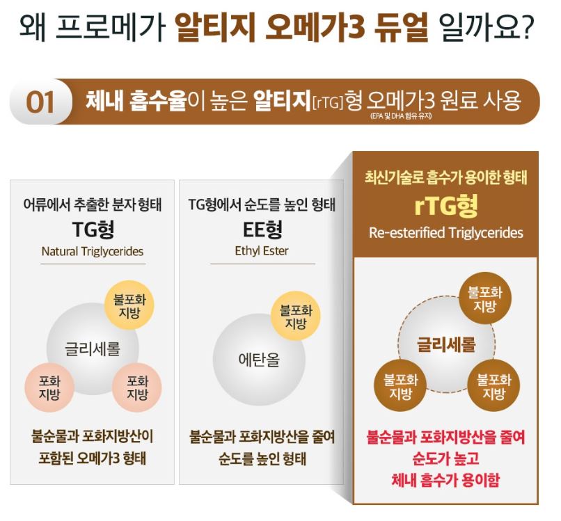 그래서 저도 평소에 눈 건조도 심하고 건망증도 심했기 때문에 오메가3의 효능을 정말 볼 수 있으면 저한테 너무 좋을 것 같다는 생각에 열심히 먹어보기로 했는데 그런데 생각지도 못한 복병이 있었어요.솔직히 오메가3가 다 똑같지 않을까 했는데 검색해보니까 왜… 종류가 너무 많아요 그래서 이 중에서 하나를 골라야 한다는데 뭐가 좋은지도 모르겠고… 고르는 게 쉽지 않거든요.그래도 다행인 게 지금은 평생 먹을 수 있는 걸 하나 제대로 골라서 큰 도움을 받았다고 생각하거든요.어떤 기준으로 뽑았는지 바로 알려드릴게요.출처 파이트리오메가3의 효능을 제대로 보고 싶다면 이것들은 면밀하게 살펴볼 필요가 있습니다. 첫 번째, 식물성에 rTG인지 꼭 체크해보세요!동물성, 식물성으로 나뉘는 오메가3 중 동물성은 환경호르몬에서 중금속과 같은 부분에 노출될 수 있기 때문에 저는 더 안전하다고 생각했던 미세조류 추출 식물성을 조사하게 되었습니다. 그리고 오메가인 TG부터 EE 그리고 마지막 rTG까지 흡수율에서 순도까지 계속 변화를 해오고 있고 현재는 체내 흡수율을 최종적으로 고려한 rTG형을 드시는 게 좋습니다.두 번째, 함량을 꼭 체크해 보세요!오메가3의 효능을 보려면 함량도 꼭 봐야 합니다.식약처에서 권고한 바로는 EPA+DHA의 합계가 900mg까지 괜찮다는 이야기를 했다고 합니다. 제 생각에도.. 너무 미량이면 먹을 것도 없을 것 같은 기분이고, 과식해도 오히려 속이 울렁거리는 등 부작용이 생길 수 있다고 해서 총 900mg 정도인지 아닌지 함량을 잘 살펴봤습니다.셋째, 산패의 위험성에 신경을 쓰고 있는지 체크해 주세요. 오메가3는 기름 성분이기 때문에 유통되는 과정이 길어질수록 산패가 될 위험이 있거든요.여기서 산패는 상하는 것을 의미하는데 이런 일을 방지하기 위해서는 유통에서 공정, 배송되는 기간이 짧은지 꼭 체크해봐야 합니다. 그리고 저는 부원료까지 다 알아보고 결론적으로는 올로메가3rTG80 원료가 들어있는 오메가3를 선택하게 됐습니다.여러가지 보았지만 올로 메가 3rTG80원료가 들어 있지만 제가 선택한 것은 1. 식물성 2.rTG형 3.EPA+DAH합계 900mg, 4. 산패의 위험을 줄인 식물성 캡슐 5. 부원료 비타민 E가 모두 포함되고 있었습니다. 그리고 비타민 E는 항산화에 도움이 될 여러분 아시죠.. 그렇지 않아도 항산화에 좋은 것을 하나 먹으려고 알아보고 있었는데, 여기에 들어 타이밍이 딱 맞겠네요~하여튼, 위의 정보를 토대로 내가 먹으면서 느낀 감정도 쓰고 싶어요 궁금한 것도 있다고 생각하니까..결론적으로 내가 오메가 3의 효능을 보았는지부터 쓰면 나는 꾸준히 먹으며 식단과 운동을 병행하면 확실히 먹기 전보다 도움이 되었다고 생각하고 있습니다!왜냐하면 콜레스테롤이나 중성 지방 같은 수치가 높을 때는 확실히 자고 일어나면 몸의 저림이 심해서 무엇을 하지 않고도 잘 부어 있었습니다. 또 두통도 잘 있고, 혈압이 높은 영향도 있다고 하지만… 그렇긴..하루 종일 이런 상태가 반복되므로 저녁이면 피곤했던 일수 있는 것이 일이거나 가족에 대한 태도를 보이고 많은 부분에 영향을 미치고 나도 정말 힘든 일이었습니다.그런데 요즘은 자고 일어나도 어딘가가 저리거나 피로감이 너무 심한 게 분명한 기분이에요 또 몸이 자주 붓기 때문에 걸을 때나 일을 할 때 굉장히 불편했는데 부종도 줄어들었다는 거.. 처음에 저는 기분 탓인 줄 알았어요.그리고 식단 조절도 하고 운동도 하니까 그런 부분에 영향도 받은 줄 알았는데 곰곰이 생각해 보니까 식단, 운동은 오래 전에도 한 적이 있었는데 그때는 그것만으로는 부족하다고 생각한 적이 몇 번 있었거든요.그래서 결론적으로는 오메가3의 효능을 저도 본 것 같고 이 패턴이 저한테는 잘 맞을 것 같아서 앞으로도 계속 먹으면서 건강하게 살려고 합니다. 아, 그리고 정말 최근에 또 건강검진을 받았는데 콜레스테롤이나 중성지방으로 전이와 차이가 많이 나서 저를 포함한 온 가족이 기뻐하고 있어요..그날은 오랜만에 치트데이도 보냈네요^^정말 건강이 최고인 것 같아요..그런 점에서 개인적인 생각이지만 오메가3는 저에게 터닝포인트 같은 선택이었던 것 같습니다.그래서 만약에 여러분들도 오메가3의 효능을 제대로 보고 싶다면 어떤 기준으로 고르느냐도 큰 역할을 할 것이기 때문에 꼭 제가 알려준 기준에 따라서 골라보시기 바랍니다.저는 너무 대만족이라서 지인들에게도 꾸준히 소개까지 하고 있어서~~ 여기에도 소감을 쓰게 된 거예요^^ 그럼 좋은 의미로 봐주시길 바라는 마음으로 마무리 해보겠습니다. 감사합니다! 본 포스팅은 개인적인 경험에 의한 리뷰이며 제품을 제공받아 섭취 후 작성한 리뷰입니다.