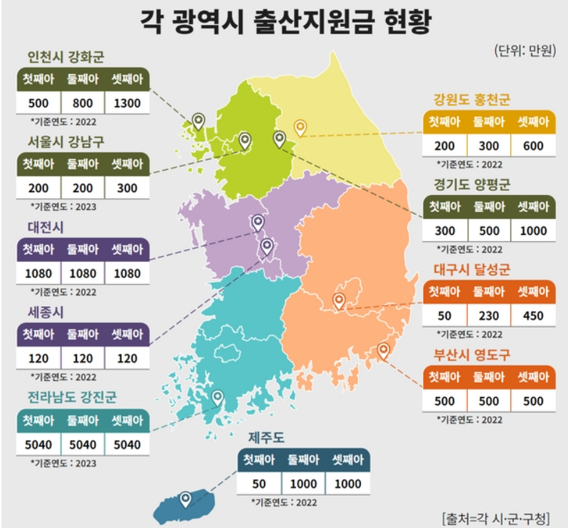 각 지역에서 태어난 아이에게 지급되는 출산보조금 금액은 서울특별시 자치구마다 다르고, 광역시 내 도도부현마다 큰 차이가 있다.