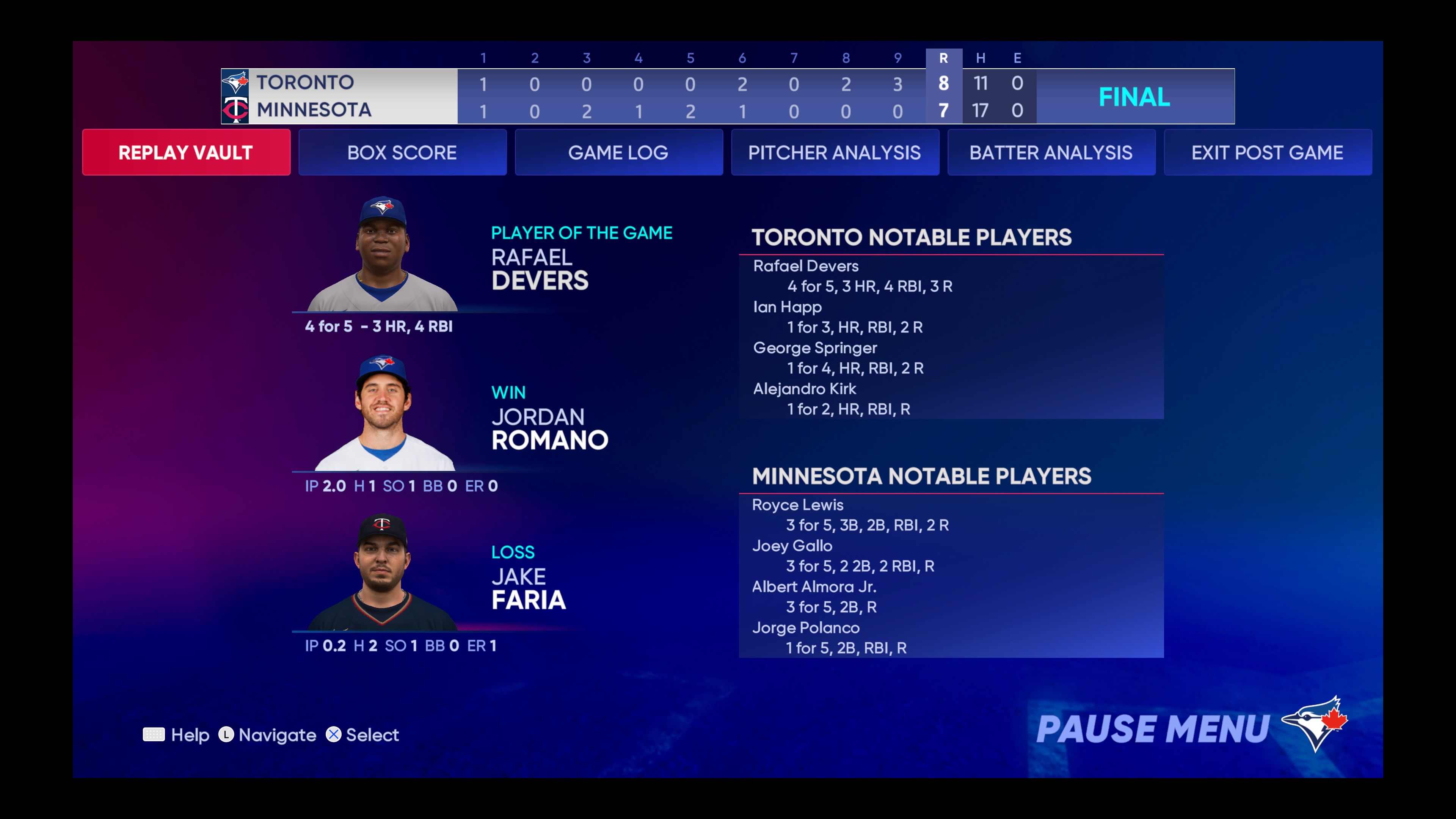 비지오는 8회 후반 비셋의 적시타와 적시 강타로 동점을 기록하며 6이닝을 4:3 무승부로 이겼다.