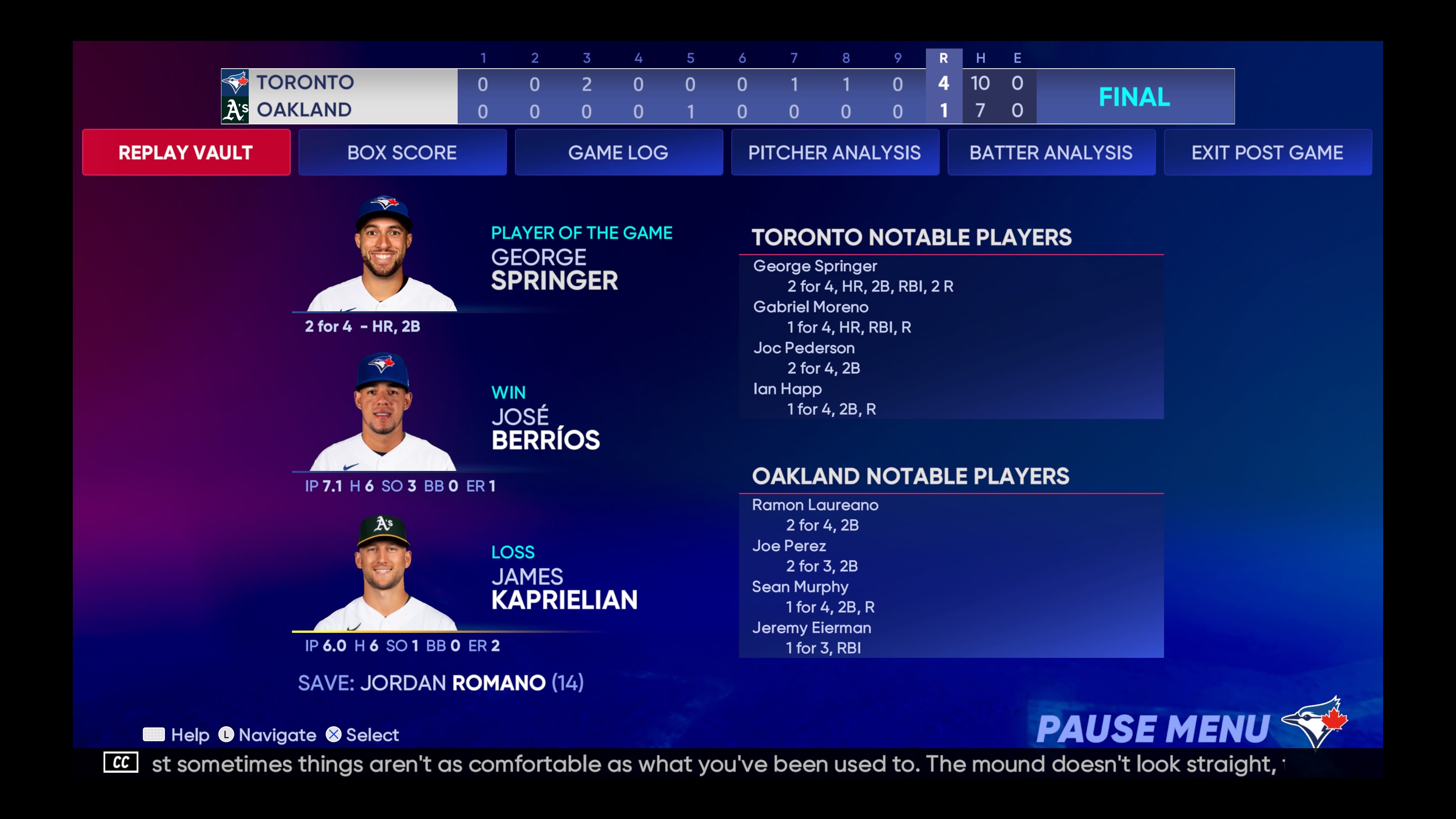 Goldsman은 8회까지 득점이 없어서 4:0이었기 때문에 9회에 서브를 하고 안타를 쳤지만 잘 막아내서 시즌 24경기 만에 완봉승을 거뒀다.