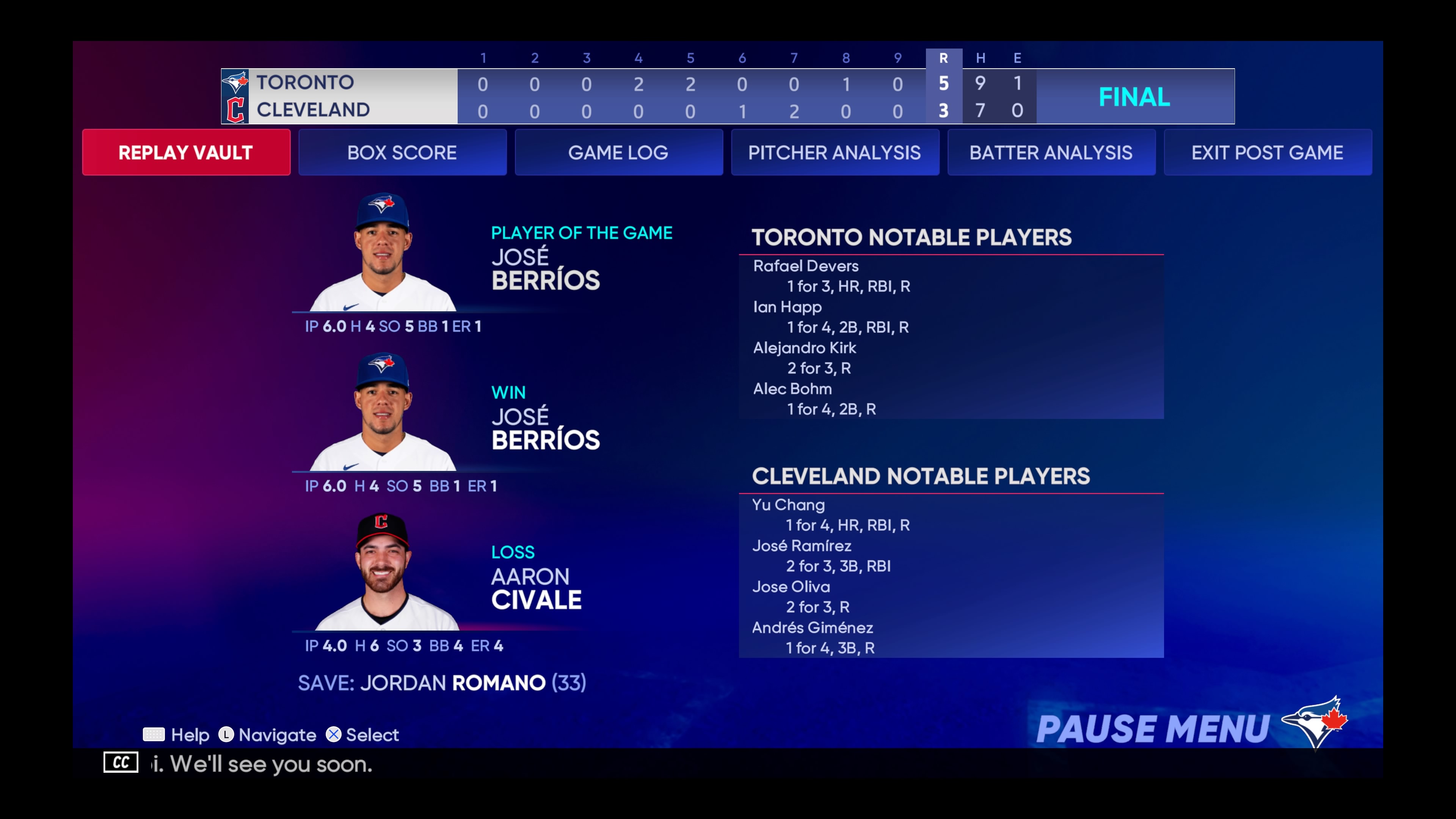 Berrios는 6이닝 동안 2실점했고 Kevin Gonzalez는 3이닝 동안 3세이브를 기록했습니다.